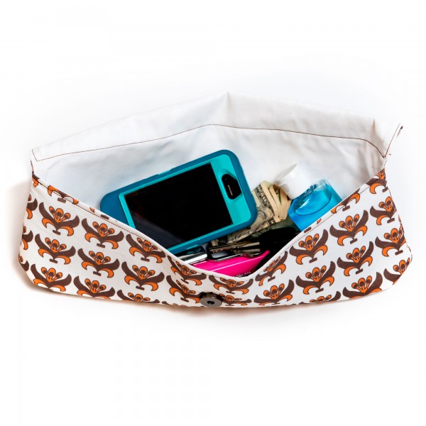 The finished dimensions of the Alison Clutch are 11″ W x 6″ H x 2″ D. The model is 5’1″ tall.